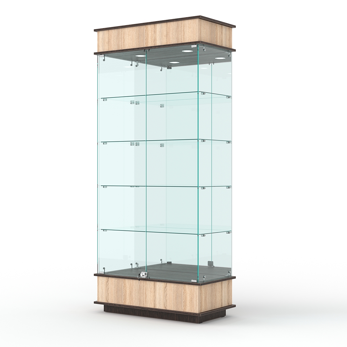 Конструкция включает четыре стеклянных полки и подиум из ЛДСП. Задняя стенка — зеркало. Корпус оборудован распашными дверцами с замком. В верхнем фризе имеется подсветка.