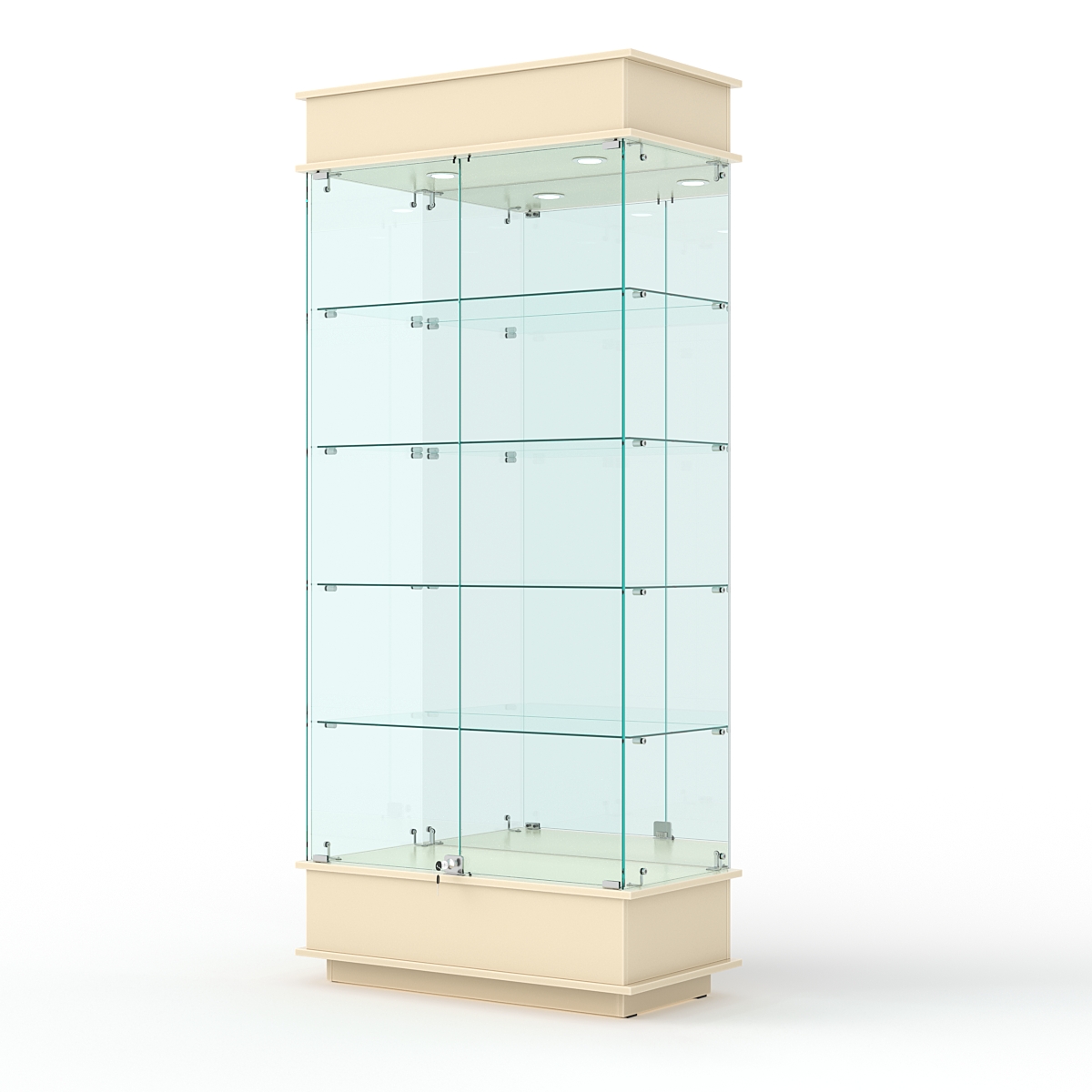 Конструкция включает четыре стеклянных полки и подиум из ЛДСП. Задняя стенка — зеркало. Корпус оборудован распашными дверцами с замком. В верхнем фризе имеется подсветка.