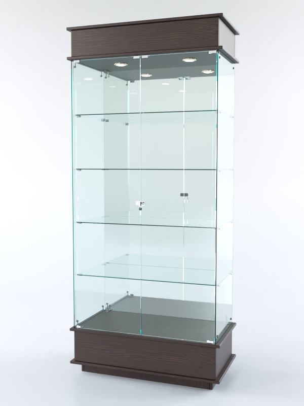 Конструкция включает четыре стеклянных полки и подиум из ЛДСП. Задняя стенка — зеркало. Корпус оборудован распашными дверцами с замком. В верхнем фризе имеется подсветка.