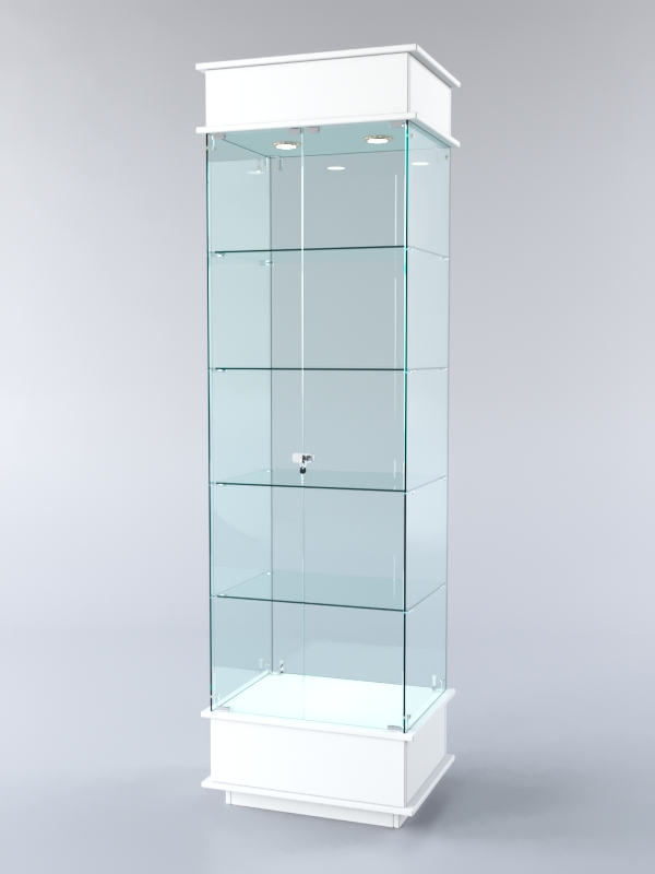 Конструкция включает четыре стеклянных полки и подиум из ЛДСП. Корпус оборудован распашной дверцей с замком. В верхнем фризе имеется подсветка.