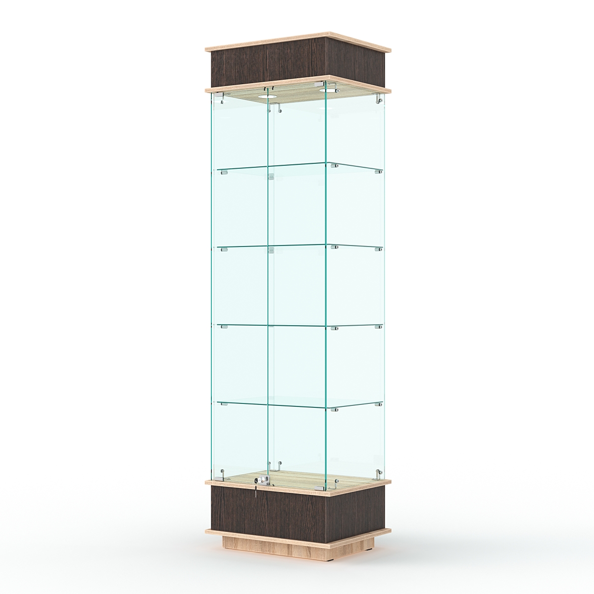 Конструкция включает четыре стеклянных полки и подиум из ЛДСП. Корпус оборудован распашной дверцей с замком. В верхнем фризе имеется подсветка.