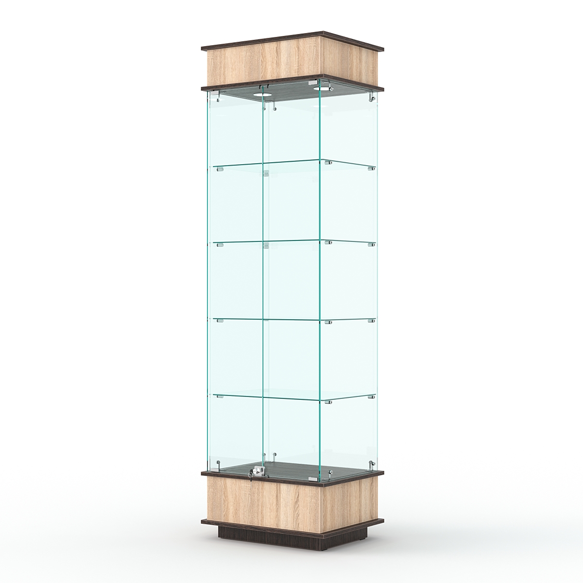 Конструкция включает четыре стеклянных полки и подиум из ЛДСП. Корпус оборудован распашной дверцей с замком. В верхнем фризе имеется подсветка.