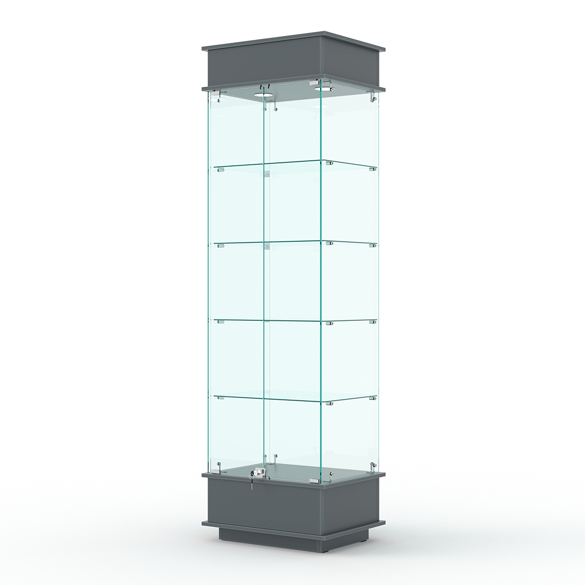 Конструкция включает четыре стеклянных полки и подиум из ЛДСП. Корпус оборудован распашной дверцей с замком. В верхнем фризе имеется подсветка.