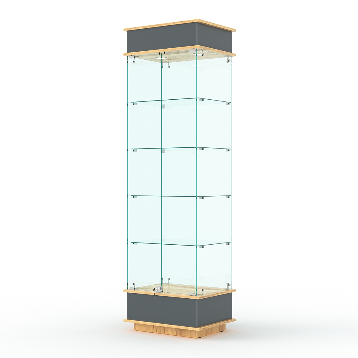 Конструкция включает четыре стеклянных полки и подиум из ЛДСП. Корпус оборудован распашной дверцей с замком. В верхнем фризе имеется подсветка.