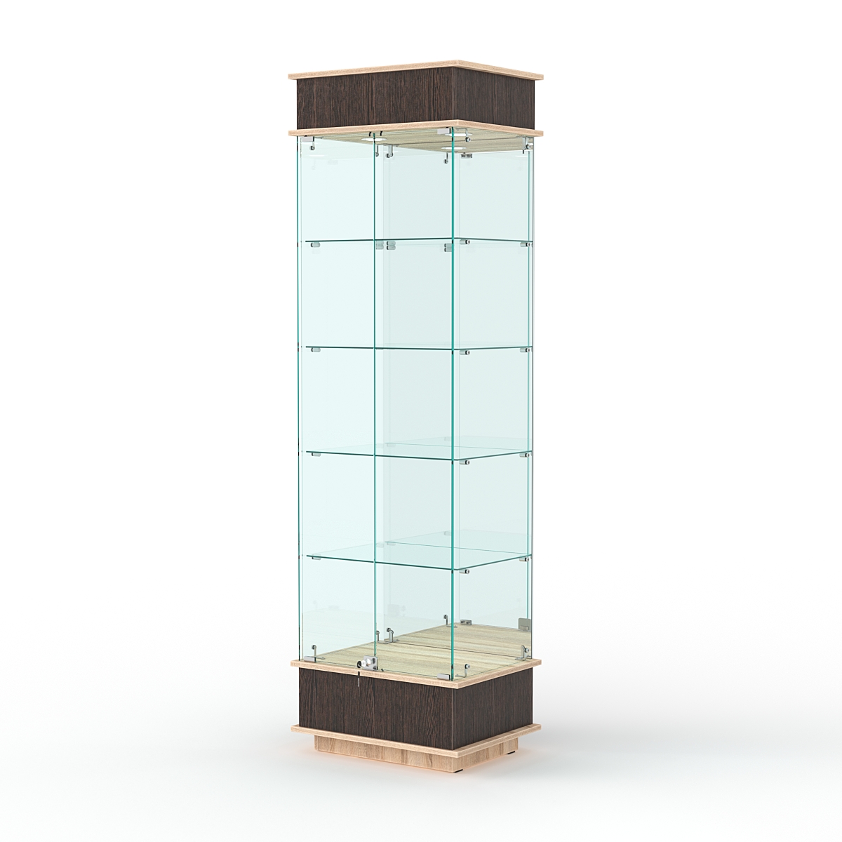 Конструкция включает четыре стеклянных полки и подиум из ЛДСП. Задняя стенка — зеркало. Корпус оборудован распашными дверцами с замком. В верхнем фризе имеется подсветка.