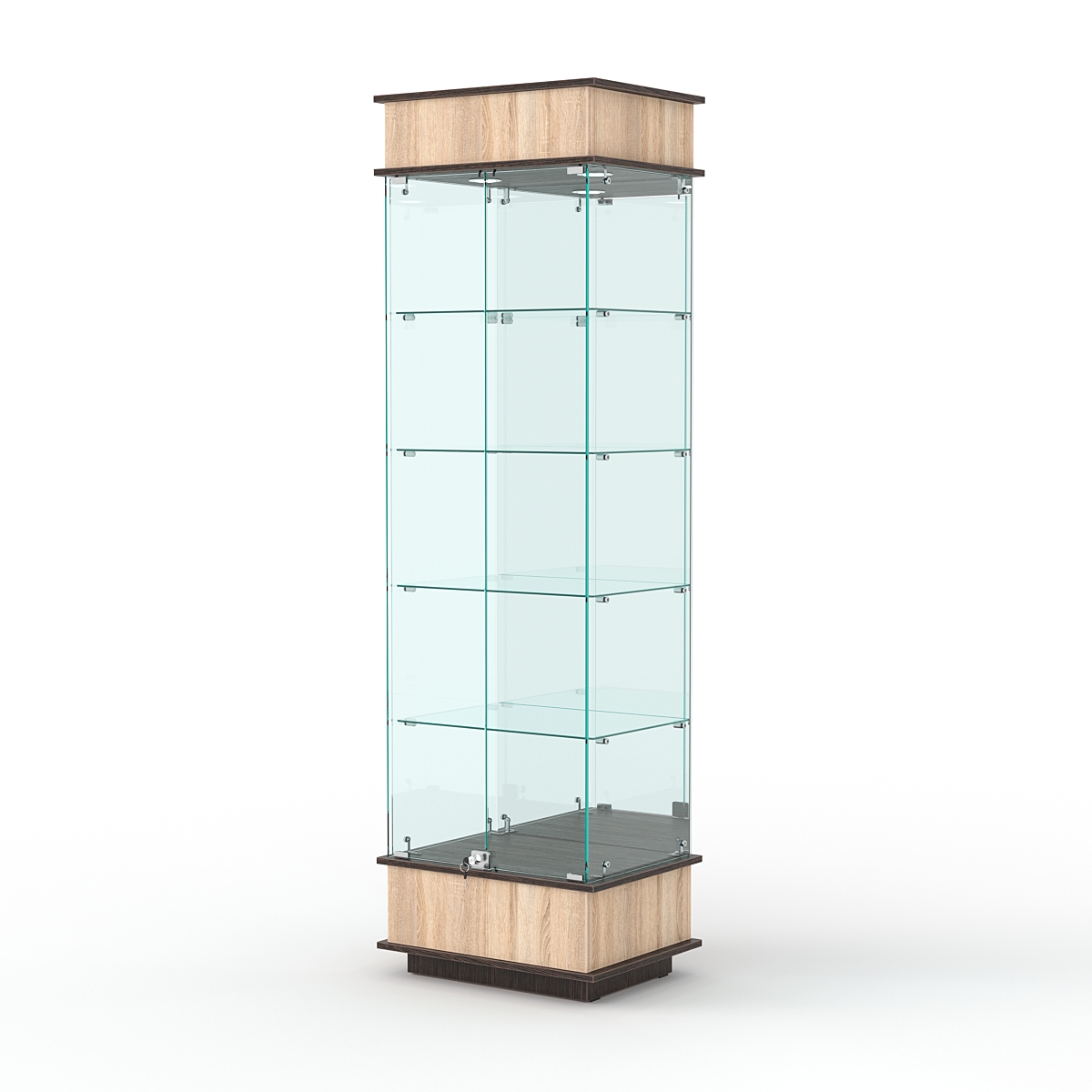 Конструкция включает четыре стеклянных полки и подиум из ЛДСП. Задняя стенка — зеркало. Корпус оборудован распашными дверцами с замком. В верхнем фризе имеется подсветка.