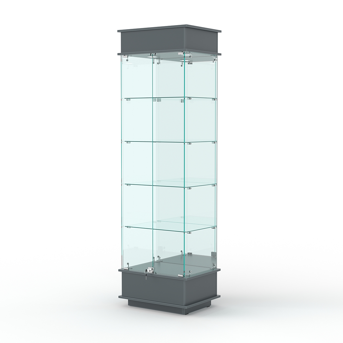 Конструкция включает четыре стеклянных полки и подиум из ЛДСП. Задняя стенка — зеркало. Корпус оборудован распашными дверцами с замком. В верхнем фризе имеется подсветка.