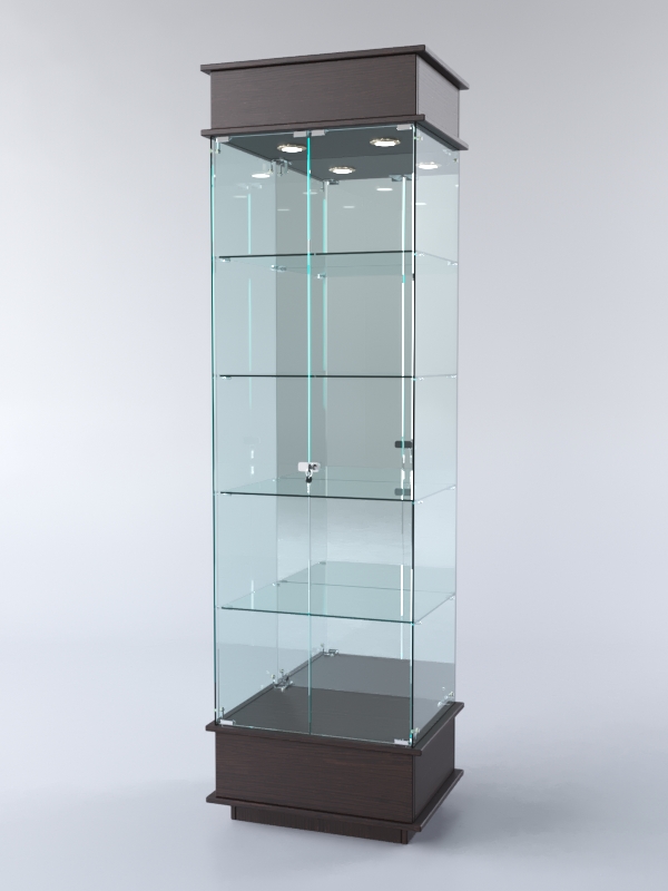 Конструкция включает четыре стеклянных полки и подиум из ЛДСП. Задняя стенка — зеркало. Корпус оборудован распашными дверцами с замком. В верхнем фризе имеется подсветка.