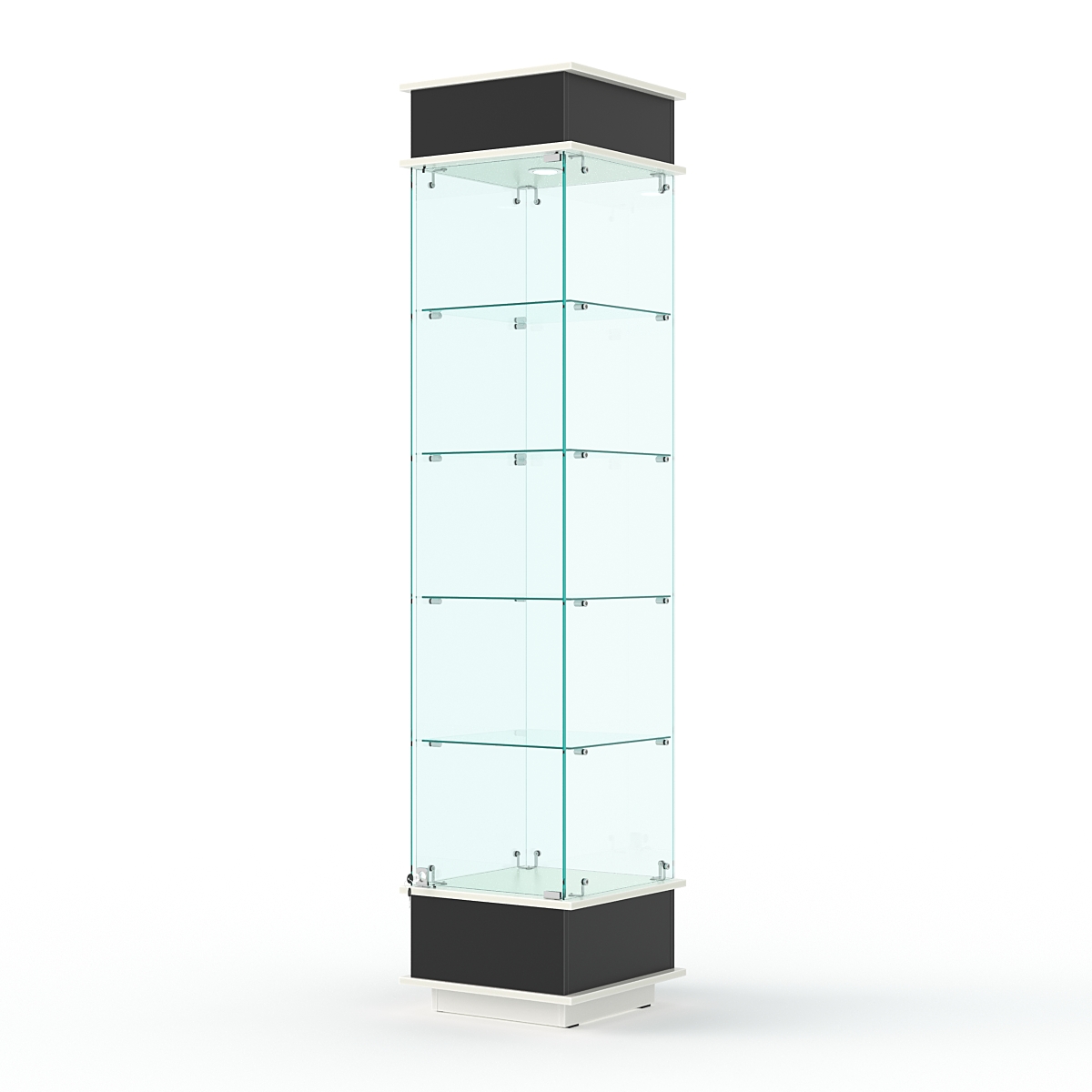 Конструкция включает четыре стеклянных полки и подиум из ЛДСП. Корпус оборудован распашной дверцей с замком. В верхнем фризе имеется подсветка.