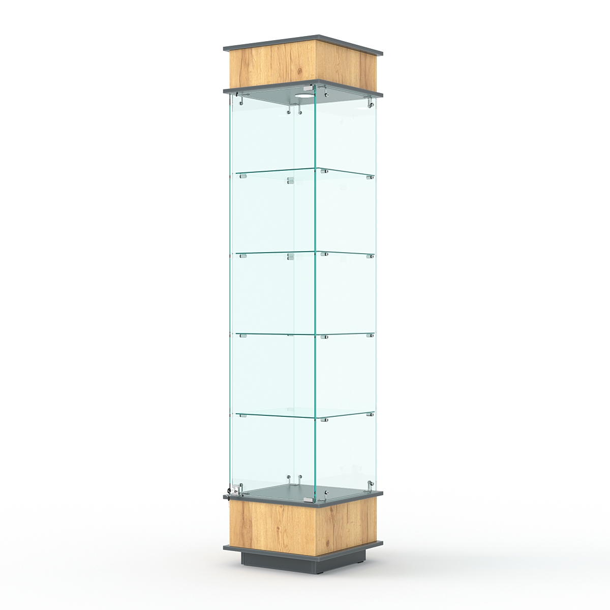 Конструкция включает четыре стеклянных полки и подиум из ЛДСП. Корпус оборудован распашной дверцей с замком. В верхнем фризе имеется подсветка.