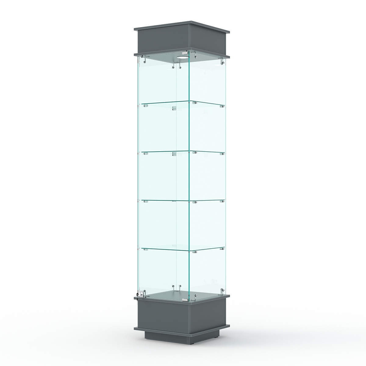 Конструкция включает четыре стеклянных полки и подиум из ЛДСП. Корпус оборудован распашной дверцей с замком. В верхнем фризе имеется подсветка.