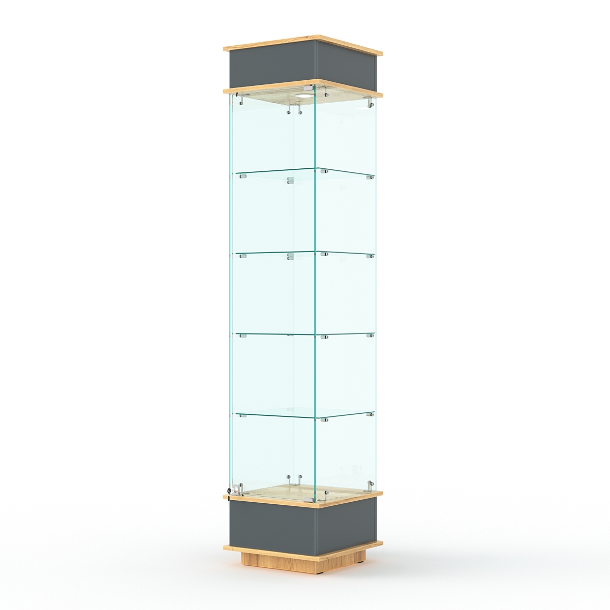 Конструкция включает четыре стеклянных полки и подиум из ЛДСП. Корпус оборудован распашной дверцей с замком. В верхнем фризе имеется подсветка.
