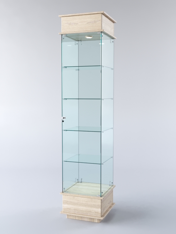 Конструкция включает четыре стеклянных полки и подиум из ЛДСП. Корпус оборудован распашной дверцей с замком. В верхнем фризе имеется подсветка.