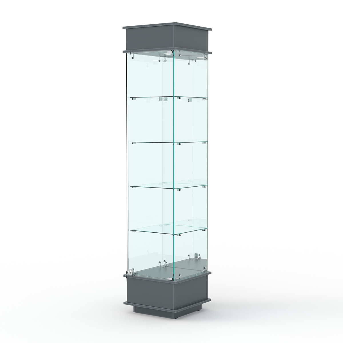 Конструкция включает четыре стеклянных полки и подиум из ЛДСП. Задняя стенка — зеркало. Корпус оборудован распашной дверцей с замком. В верхнем фризе имеется подсветка.
