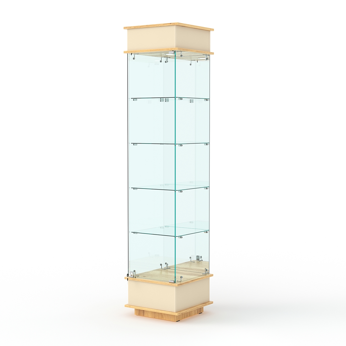 Конструкция включает четыре стеклянных полки и подиум из ЛДСП. Задняя стенка — зеркало. Корпус оборудован распашной дверцей с замком. В верхнем фризе имеется подсветка.