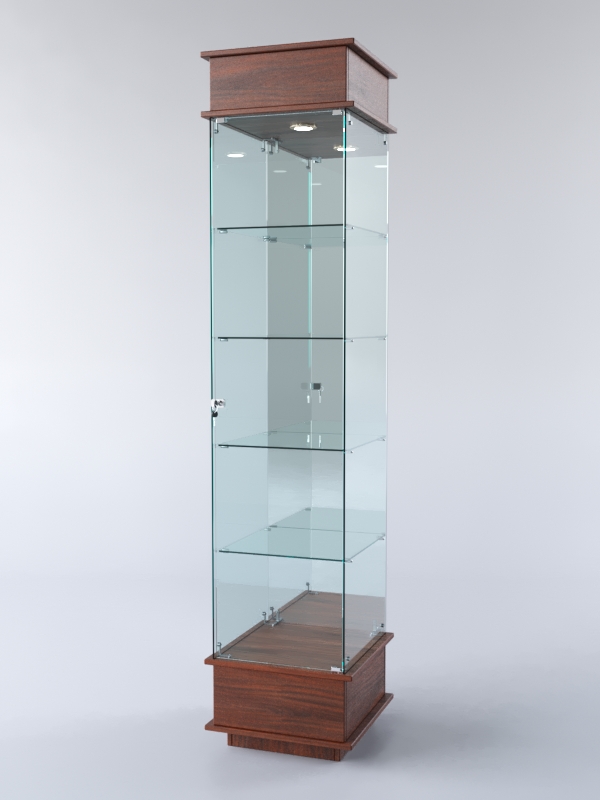Конструкция включает четыре стеклянных полки и подиум из ЛДСП. Задняя стенка — зеркало. Корпус оборудован распашной дверцей с замком. В верхнем фризе имеется подсветка.