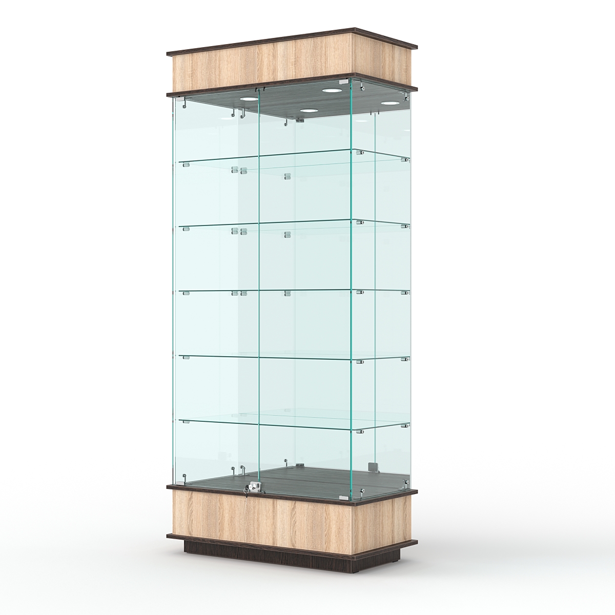 Конструкция включает пять стеклянных полок и подиум из ЛДСП. Задняя стенка — зеркало. Корпус оборудован распашными дверцами с замком. В верхнем фризе имеется подсветка.