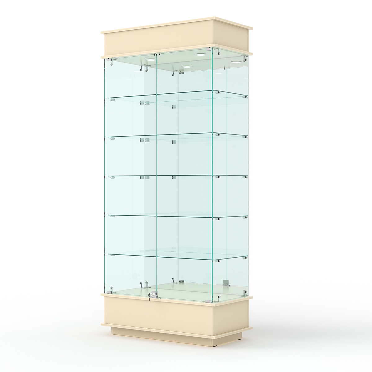 Конструкция включает пять стеклянных полок и подиум из ЛДСП. Задняя стенка — зеркало. Корпус оборудован распашными дверцами с замком. В верхнем фризе имеется подсветка.