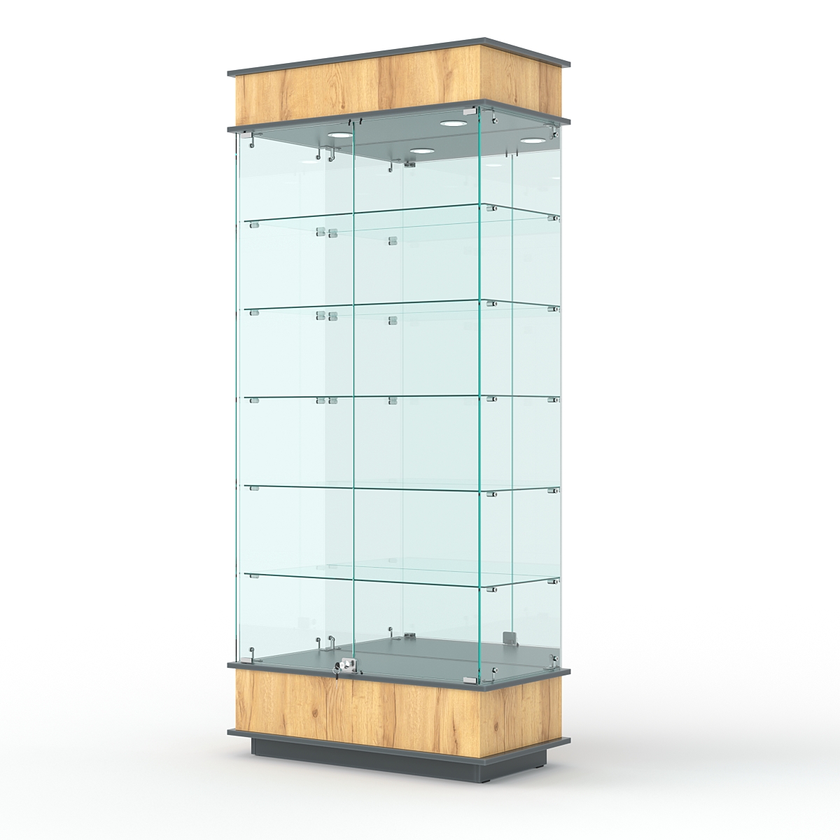 Конструкция включает пять стеклянных полок и подиум из ЛДСП. Задняя стенка — зеркало. Корпус оборудован распашными дверцами с замком. В верхнем фризе имеется подсветка.