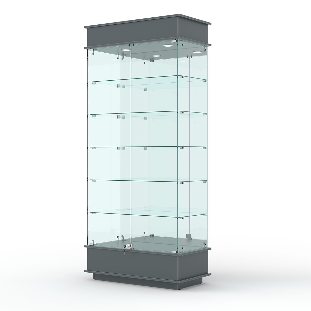 Конструкция включает пять стеклянных полок и подиум из ЛДСП. Задняя стенка — зеркало. Корпус оборудован распашными дверцами с замком. В верхнем фризе имеется подсветка.