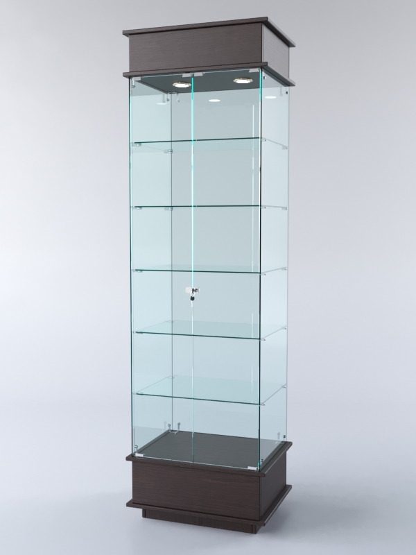Конструкция включает пять стеклянных полок и подиум из ЛДСП. Корпус оборудован распашными дверцами с замком. В верхнем фризе имеется подсветка.