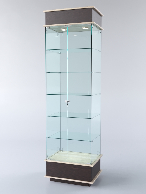 Конструкция включает пять стеклянных полок и подиум из ЛДСП. Корпус оборудован распашными дверцами с замком. В верхнем фризе имеется подсветка.