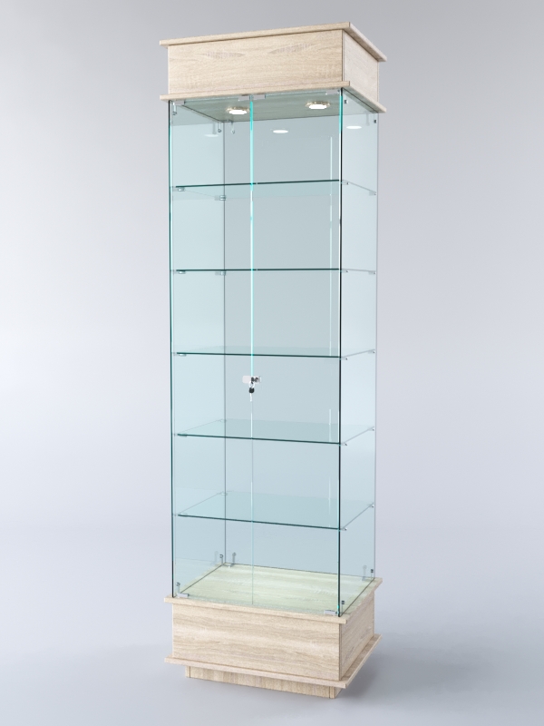 Конструкция включает пять стеклянных полок и подиум из ЛДСП. Корпус оборудован распашными дверцами с замком. В верхнем фризе имеется подсветка.