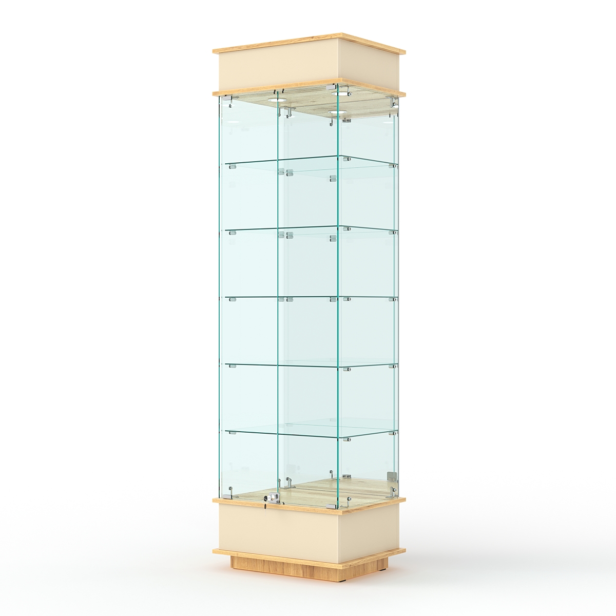 Конструкция включает пять стеклянных полок и подиум из ЛДСП. Задняя стенка — зеркало. Корпус оборудован распашными дверцами с замком. В верхнем фризе имеется подсветка.