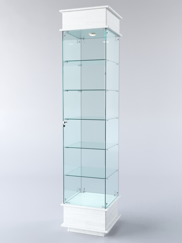 Конструкция включает пять стеклянных полок и подиум из ЛДСП. Корпус оборудован распашной дверцей с замком. В верхнем фризе имеется подсветка.