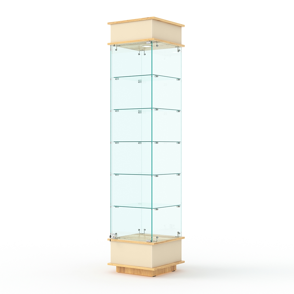 Конструкция включает пять стеклянных полок и подиум из ЛДСП. Корпус оборудован распашной дверцей с замком. В верхнем фризе имеется подсветка.