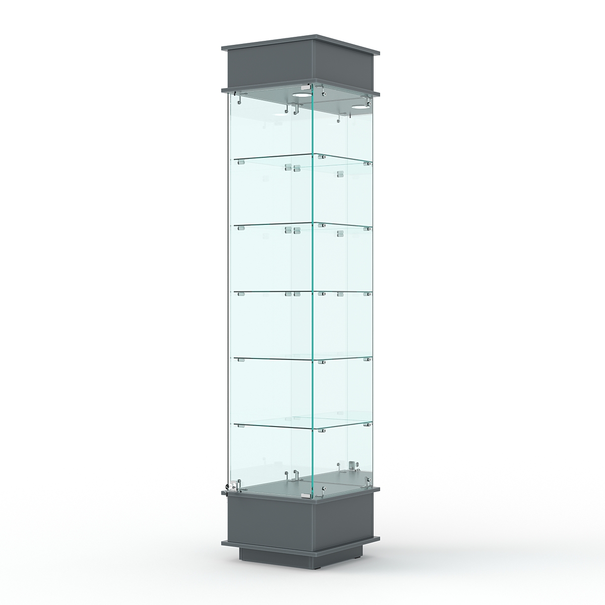 Конструкция включает пять стеклянных полок и подиум из ЛДСП. Задняя стенка — зеркало. Корпус оборудован распашной дверцей с замком. В верхнем фризе имеется подсветка.