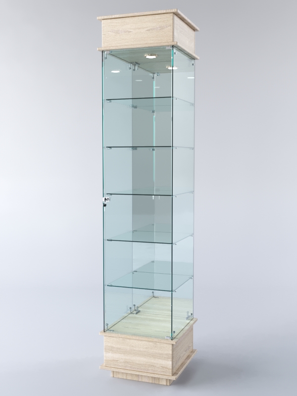 Конструкция включает пять стеклянных полок и подиум из ЛДСП. Задняя стенка — зеркало. Корпус оборудован распашной дверцей с замком. В верхнем фризе имеется подсветка.