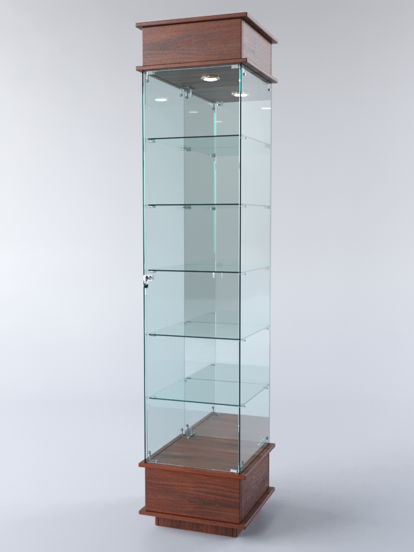 Конструкция включает пять стеклянных полок и подиум из ЛДСП. Задняя стенка — зеркало. Корпус оборудован распашной дверцей с замком. В верхнем фризе имеется подсветка.