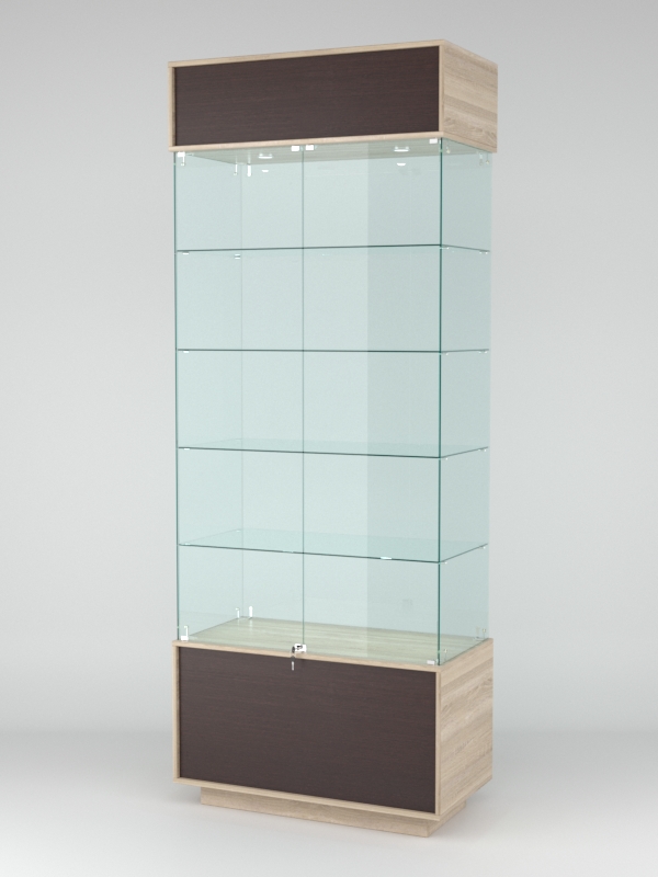 Конструкция включает четыре стеклянные полки и подиум. Корпус оборудован распашными дверцами с замком. В верхнем фризе имеется подсветка.