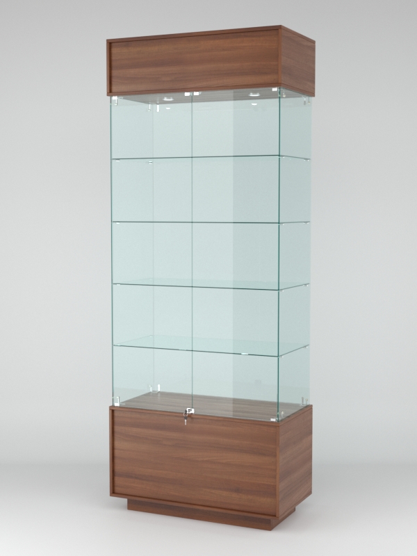 Конструкция включает четыре стеклянные полки и подиум. Корпус оборудован распашными дверцами с замком. В верхнем фризе имеется подсветка.