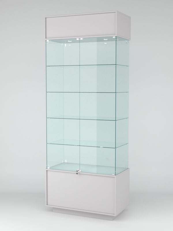 Конструкция включает четыре стеклянные полки и подиум. Корпус оборудован распашными дверцами с замком. В верхнем фризе имеется подсветка.