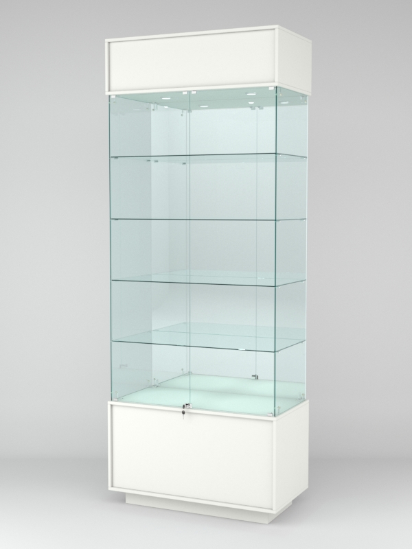 Конструкция включает четыре стеклянные полки и подиум из ЛДСП. Задняя стенка — зеркало. Корпус оборудован распашными дверцами с замком. В верхнем фризе имеется подсветка.