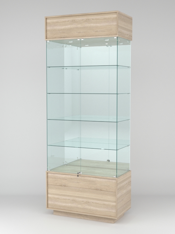 Конструкция включает четыре стеклянные полки и подиум из ЛДСП. Задняя стенка — зеркало. Корпус оборудован распашными дверцами с замком. В верхнем фризе имеется подсветка.