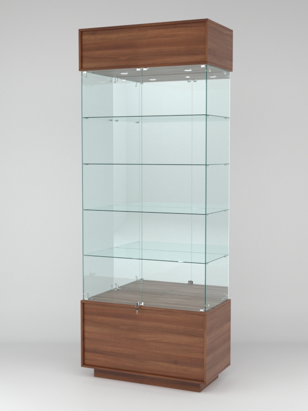 Конструкция включает четыре стеклянные полки и подиум из ЛДСП. Задняя стенка — зеркало. Корпус оборудован распашными дверцами с замком. В верхнем фризе имеется подсветка.