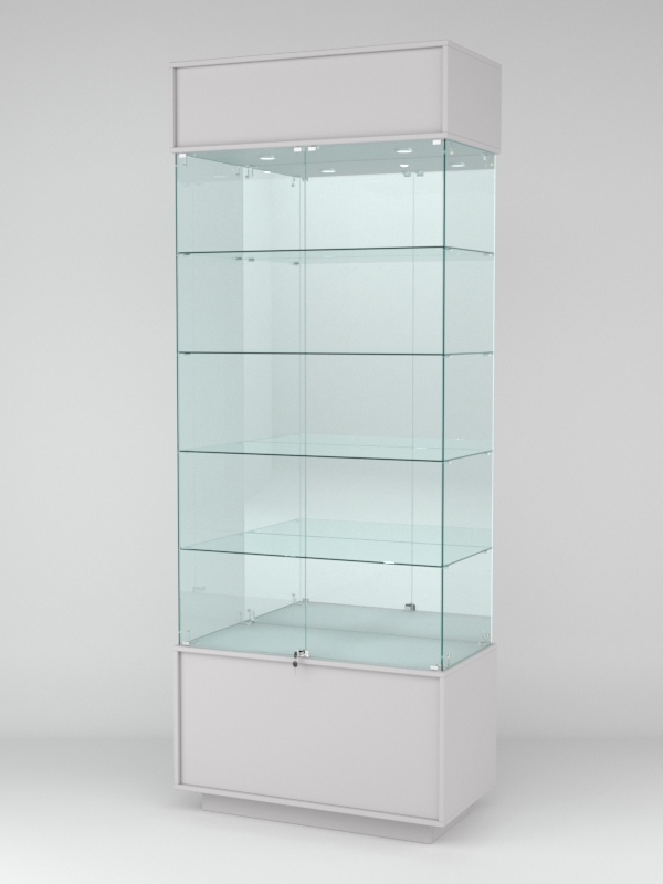 Конструкция включает четыре стеклянные полки и подиум из ЛДСП. Задняя стенка — зеркало. Корпус оборудован распашными дверцами с замком. В верхнем фризе имеется подсветка.