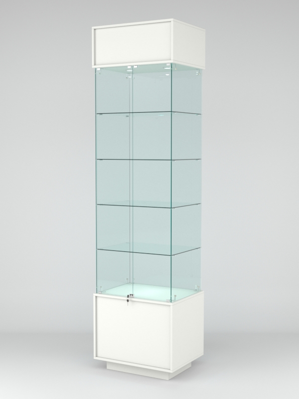 Конструкция включает четыре стеклянные полки и подиум из ЛДСП. Корпус оборудован распашной дверцей с замком. В верхнем фризе имеется подсветка.