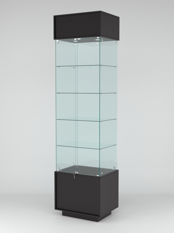Конструкция включает четыре стеклянные полки и подиум из ЛДСП. Корпус оборудован распашной дверцей с замком. В верхнем фризе имеется подсветка.