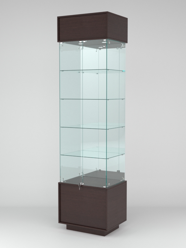 Конструкция включает четыре стеклянные полки и подиум из ЛДСП. Задняя стенка — зеркало. Корпус оборудован распашной дверцей с замком. В верхнем фризе имеется подсветка.