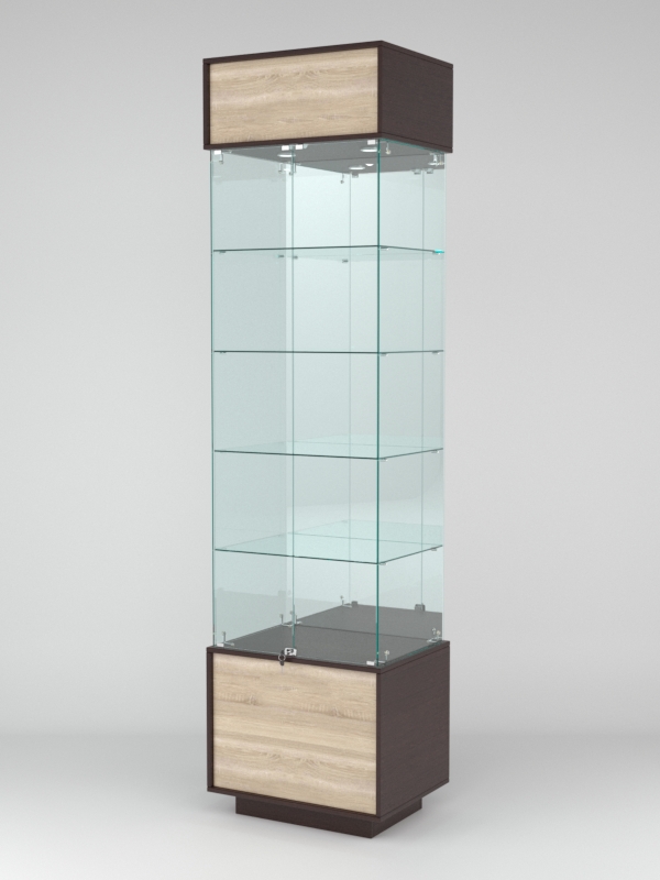 Конструкция включает четыре стеклянные полки и подиум из ЛДСП. Задняя стенка — зеркало. Корпус оборудован распашной дверцей с замком. В верхнем фризе имеется подсветка.