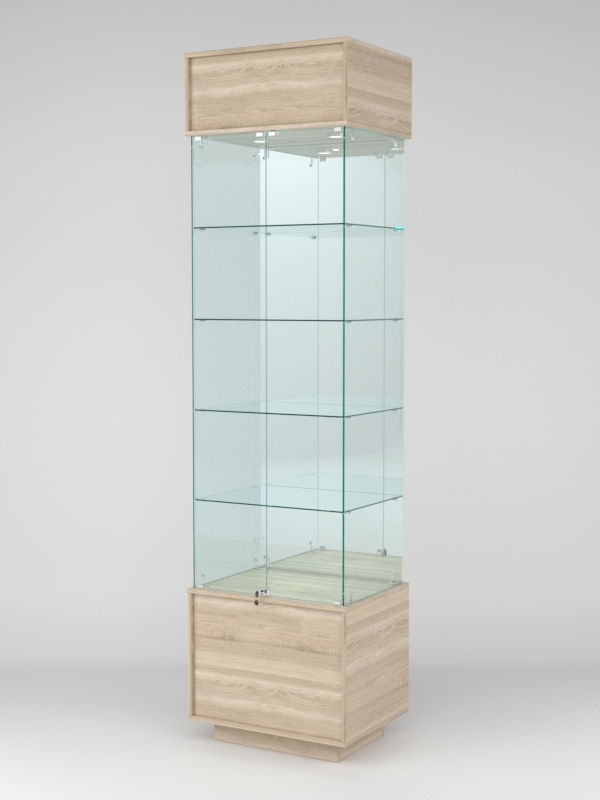 Конструкция включает четыре стеклянные полки и подиум из ЛДСП. Задняя стенка — зеркало. Корпус оборудован распашной дверцей с замком. В верхнем фризе имеется подсветка.