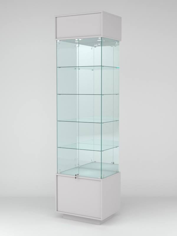 Конструкция включает четыре стеклянные полки и подиум из ЛДСП. Задняя стенка — зеркало. Корпус оборудован распашной дверцей с замком. В верхнем фризе имеется подсветка.