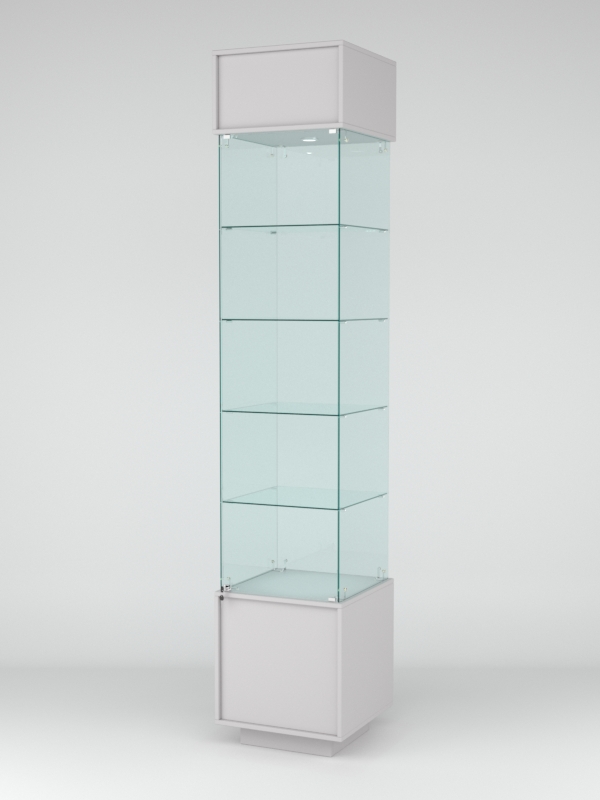 Конструкция включает четыре стеклянные полки и подиум из ЛДСП. Корпус оборудован распашной дверцей с замком. В верхнем фризе имеется подсветка.