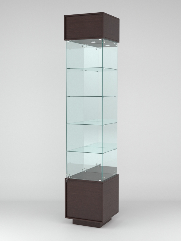 Конструкция включает четыре стеклянные полки и подиум из ЛДСП. Задняя стенка — зеркало. Корпус оборудован распашной дверцей с замком. В верхнем фризе имеется подсветка.