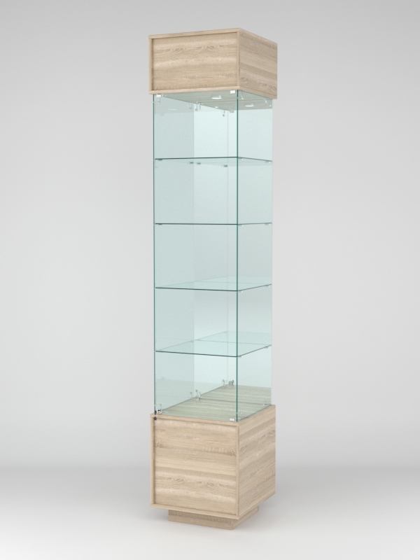 Конструкция включает четыре стеклянные полки и подиум из ЛДСП. Задняя стенка — зеркало. Корпус оборудован распашной дверцей с замком. В верхнем фризе имеется подсветка.