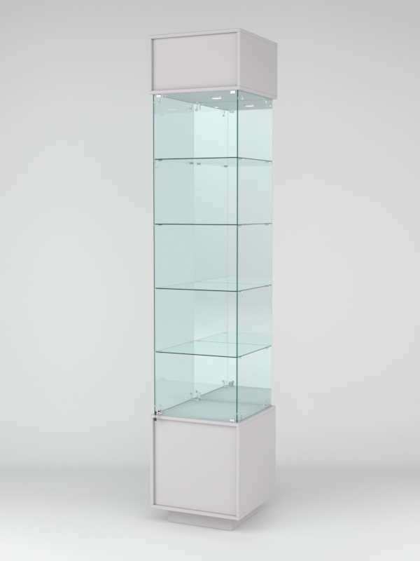 Конструкция включает четыре стеклянные полки и подиум из ЛДСП. Задняя стенка — зеркало. Корпус оборудован распашной дверцей с замком. В верхнем фризе имеется подсветка.